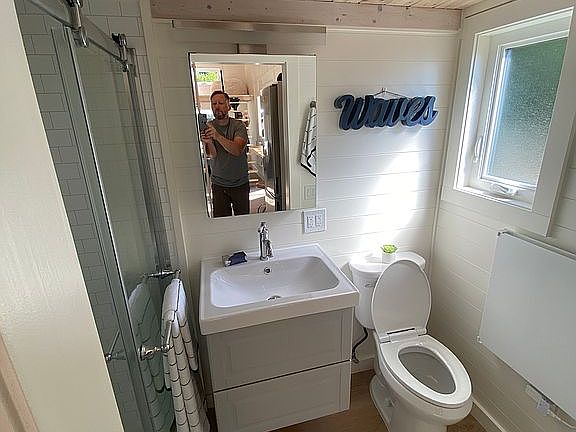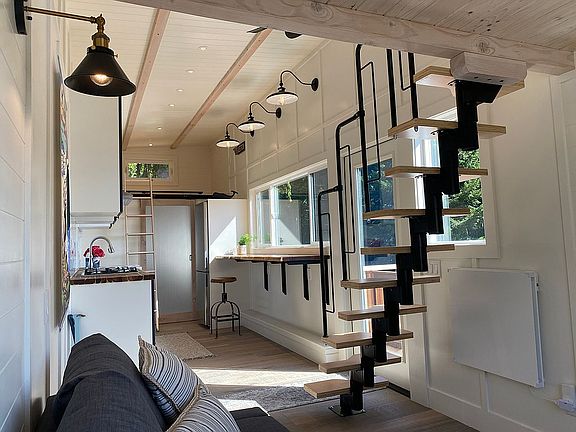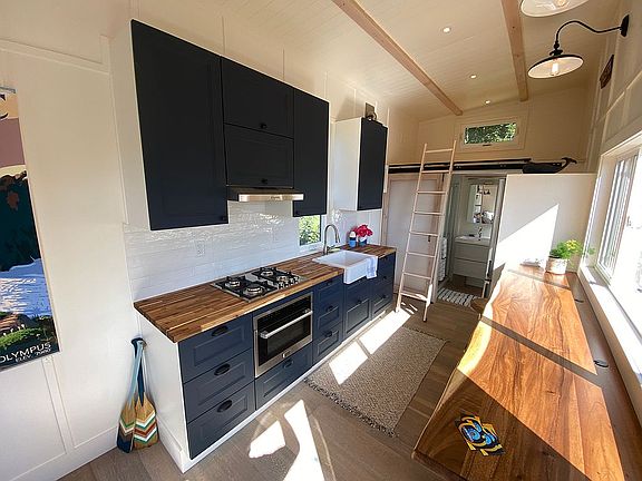 Please contact Brandon Orbanosky for more information 360-516-9412 or lightworksutube@gmail.com. Modern farmhouse tiny home, luxurious features to include wainscoting, wide plank rustic hardwood floors and beautiful lighting. Tiny home is plug and play ready, with a 50-amp connection, RV style sewer hookup and fresh water inlet. Home features radiant heat, apron front sink, and lots of counter space, also includes a propane tankless water heater for never ending hot showers. Kitchen has large beautiful cabinets, propane cooktop and a convection oven microwave. Home is stick built on an Iron Eagle tiny home-specific trailer with triple axles and power breaks. Home comes with sofa in living room that converts into a queen size bed with built-in storage, home offers two sleeping lofts one queen size the other full size. Additionally, home comes with hookups for washer and dryer.