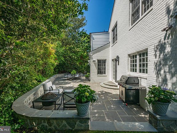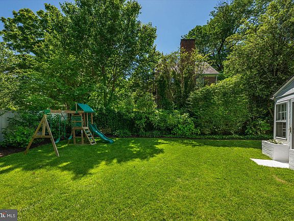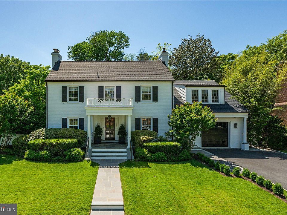 This storybook white brick colonial home exudes charm and elegance, offering a spacious living space fully designed from top to bottom by Griffith Blythe Interiors. Situated on a corner lot in the highly sought-after Chevy Chase, this updated and expanded home features five bedrooms and four and a half bathrooms. The main level highlights a gourmet eat-in kitchen with a breakfast nook, center island, stainless steel appliances, and marble countertops. The kitchen seamlessly flows into the family room with custom built-ins, a wood-burning fireplace, and access to the back patio. A butler’s pantry connects the kitchen to the formal dining room, complete with a wet bar. The formal living room boasts a wood-burning fireplace and French doors that open up to the sunroom. Finishing this level is a powder bath, a welcoming foyer with a coat closet, and a conveniently located mudroom with two stackable washers/dryers, a sink, built-in cubbies with a bench, access to a single-car garage, and an additional door leading to the driveway. On the second level, you'll find five bedrooms and three full bathrooms, including an oversized primary suite with an updated ensuite and walk-in closet. The third level offers a large open space, perfect for a playroom or home office. The lower level features a recreation room that has been turned into an exercise room with mirrors and gym flooring, plus an oversized storage room with an additional full bathroom and laundry area. Outside, the fenced-in backyard is an extension of the home, with a large flagstone patio that is ideal for enjoying morning coffee or evening drinks, while still having a flat yard space. With an attached single-car garage and additional driveway parking, convenience is at your doorstep. Perfectly located on a tree-lined street in the highly sought-after Chevy Chase, this home is convenient to downtown Bethesda, Rock Creek Park, and the future Connecticut Avenue Purple Line stop, offering access to surrounding shops and restaurants. Don't miss the opportunity to make this stunning Chevy Chase property your new home!