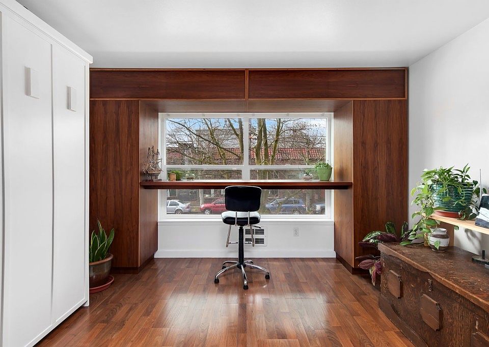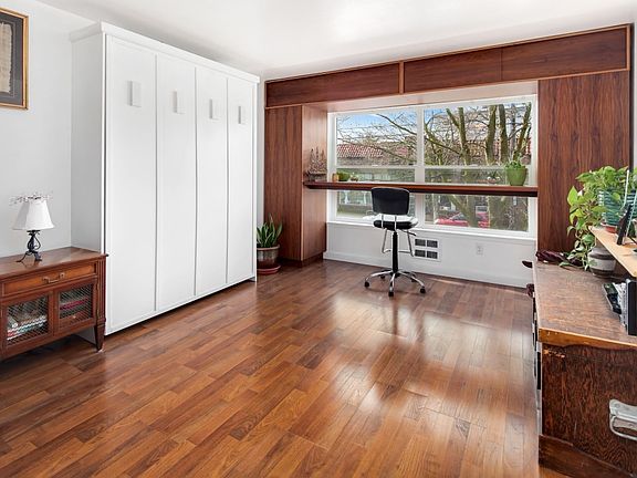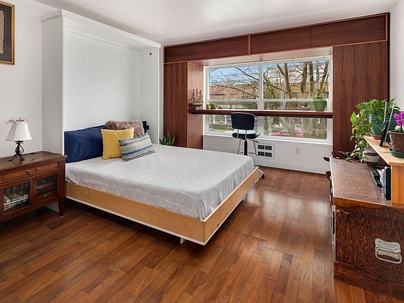 Charming studio in heart of Phinney. Hardwood floors throughout main living space. Plenty of storage space in closets and custom walnut cabinetry. Desk nook by window with lots of natural light. Built-in Murphy bed maximizes living space. Kitchen equipped with stainless steel appliances, wood cabinets, and granite counter tops. Bathroom has granite sink vanity, and shower/tub. Covered, secure parking. Close proximity to public transport, 99, Green Lake, restaurants/bars, grocery store, library.
