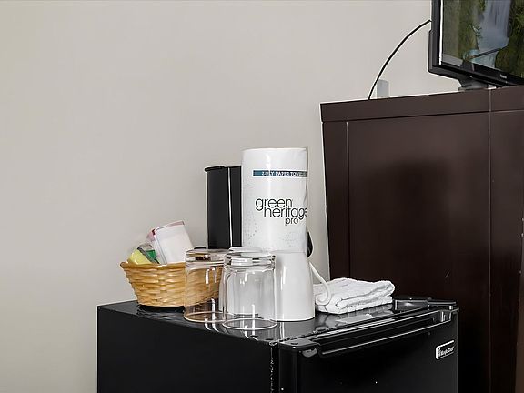 This comfortable studio suite offers a king-size bed and a spacious bathroom with a bathtub/shower combo. The room includes a TV with complimentary cable, high-speed internet, a mini fridge, a coffee maker, and central air conditioning to ensure comfort throughout your stay. Guests have access to shared property amenities including a spacious furnished patio, communal BBQ and outdoor dining area, arcade room, onsite restaurant and bar, basketball court, and a 24/7 laundry room. Please note, this unit does not include a kitchen.