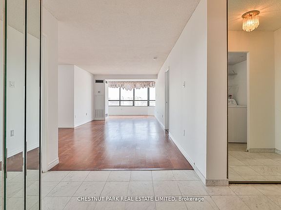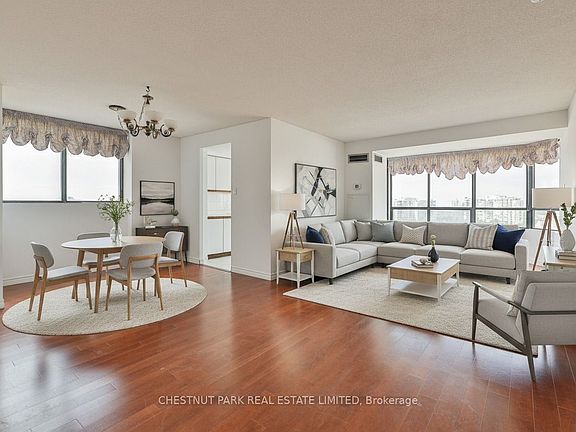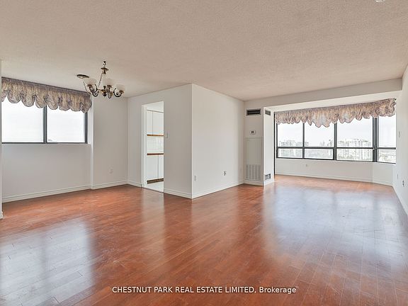 Incredibly spacious and bright 2 bedroom, 2 bathroom suite that is being offered on the market for the first time ever. The suite is very spacious with generous sized rooms, and has 1,222 sq feet of interior space that is a highly functional layout and offers tons of natural light and a spectacular view. Formal living room and separate dining room. Well laid out eat-in kitchen with wrap around windows. Stainless steel fridge and dishwasher. Great primary suite with a large window, a big walk-in closet and 3-piece ensuite. The second bedroom is located on the other side of the suite, offering privacy. This bedroom is large and has a full size closet. There is a second full bathroom with a bath tub. Tiled entrance foyer with coat closet. Laundry room with additional storage. Linen closet. The building is well regarded and the amenities include outdoor pool, tennis court, and sauna. Located in the heart of Thornhill, this location is unbeatable for convenience. All the services you could need across the street - groceries, shops, movie theatre. Around the block from parks, playground, library. Incredible access to public transportation. All utilities + cable TV are included in the maintenance fees. This unit is sold as-is.