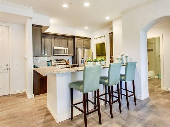 Step in to this impeccable, modern condo in Corriente community. This home features a neutral color palette, 10ft ceilings, open concept great room, split master floor plan and private balcony overlooking lush community landscaping and pool. Kitchen boasts granite countertops, breakfast bar and stainless appliances. Spacious master bedroom offers en-suite bath with oversized glass walled shower. Community features include fitness center community room with full kitchen available for events, and resort style pool and spa.