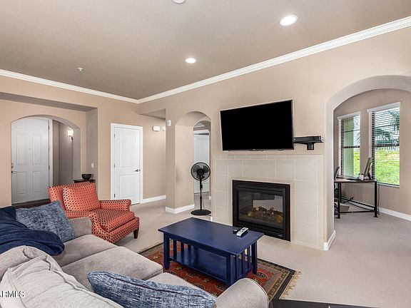 Come see this delightful 2 bedroom home at Corriente Condominiums! This 2nd level condo offers a bright & large open floor plan with soft tan paint, carpet, recessed lighting, and wall crown moulding. The living area features a 2-way fireplace shared with the sizable den. The functional kitchen boasts abundant storage inside the tall espresso cabinets, granite counters & backsplash, and stainless steel appliances. The primary bedroom hosts a spacious bathroom with two sinks, a step-in shower, and a walk-in closet. Laundry room inside with attached cabinetry. This end-unit allows fantastic views of the lake & mountains. This fabulous community includes heated pool & spa, media room, clubhouse, golf course, and workout facility. Gracious living at its finest! Don't miss this opportunity!
