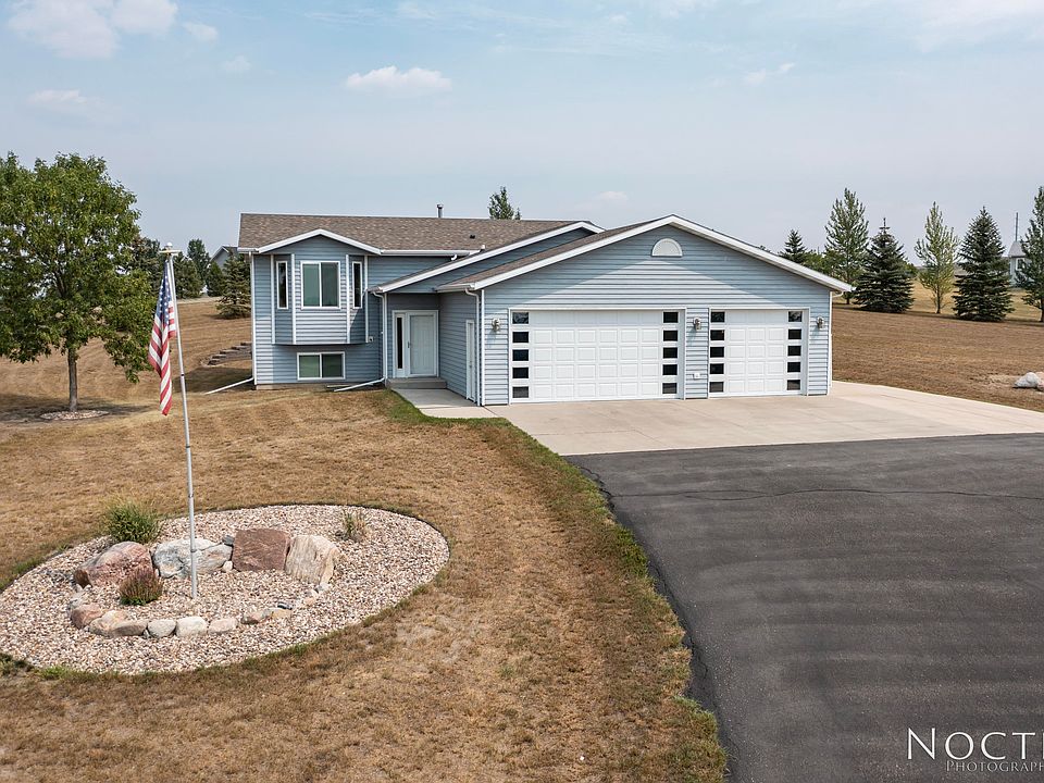 PRICE REDUCED 20K Is county living calling your name??? If so, here is the property for you...and did I mention the beautiful view? This property offers that and SO much more. Located minutes from Bismarck is where you will find this wonderful Split Level home that was built in 2002 and offers 4 bedrooms, 3 baths, 1.95 acres with trees and a great detached garage. When entering the home you will enjoy the welcoming energy, natural sunlight and openness that this property has to offer. On the upper level you will find a living room with great windows to watch the sunset, dining room with patio doors out to the deck so you can watch the sunrise with your favorite cup of coffee. This level also offers a full bath, bedroom and master bedroom and bath. The lower level offers garden windows for ample natural light and warmth. You will enjoy time spent in the open family room with a wet bar. This level also offers 2 bedrooms, full bath, laundry and mechanical room. Attached to the property there is a 3 stall garage that is insulated, finished, heated with floor drain and water. The built in cabinets are a bonus that will stay with the property. With the outside space that is part of this property (1.95 acres) there is a great detached garage (24x24)that is insulated, finished and heated. The property has beautiful landscaping and mature trees. Here are some BONUS items to this wonderful property. Triple pane windows 2019, Furnace and AC 2016, water heater 2019, Rain Soft water treatment/softener and reverse osmosis drinking water system, surround sound in family room and custom cabinets in the attached garage. Call your favorite realtor today so that you can ''See the Possibilities.''
