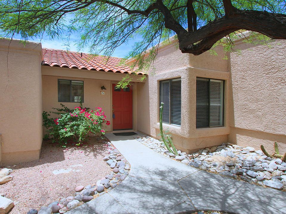''Rancho Sin Vacas Villas'' are nestled in northern Tucson's majestic Catalina Mountains. This exclusive community of private homes and villas are gated with 24/7 guard security. Enjoy this beautiful, move-in ready home with an open spacious floor plan and vaulted ceilings. A Kiva Fireplace adds a cozy warm atmosphere. Kitchen offers lots of cupboard space and a breakfast bar. HOA pays for water, sewer, trash, roof, exterior of home, common area maintenance including community pool and spa. Relax in the Heated Community Pool & Jacuzzi with Complimentary high speed wireless internet, and utilize the Fitness Center in the beautifully furnished Clubhouse. Close to shopping and restaurants. This particular unit is situated away from parking lots and roads, quiet and private. A MUST SEE!