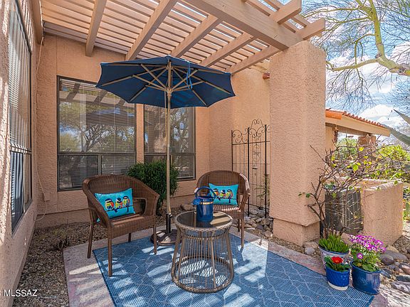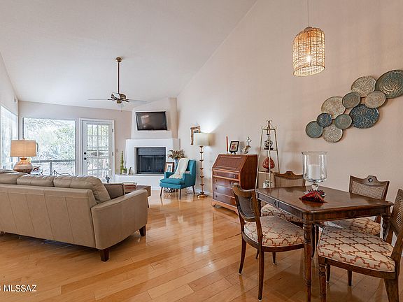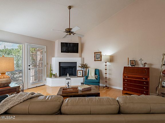 An absolutely delightful unit in gate Sin Vacas awaits a discerning buyer looking for a peaceful respite to enjoy the best of Tucson's lifestyle. The unit is warm and inviting offering a lovely great room w/corner fireplace and dining area. Relax in the private covered patio or enjoy the community pool and clubhouse where you can meet neighbors. The unit includes a primary room w/corner windows and a bathroom w/updated shower and vanity. The second bedroom is perfect for guests or used as an office. The kitchen has SS appliances, granite counters and a custom tile backsplash. You will love the community club house and pool which are in walking distance to the unit. Assigned parking space #25. Don't miss out on this lovely unit!