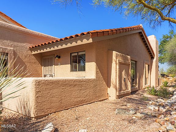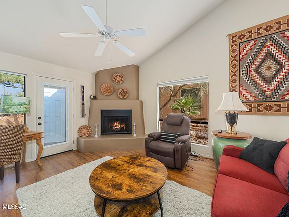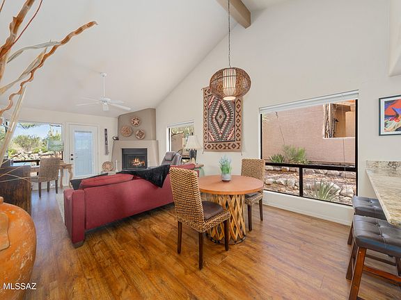 Nestled in the beautiful gated community of Sin Vacas surrounded by multi-million dollar homes, this meticulously maintained 2-bedroom, 1-bath townhome is move in ready. A rare corner/end unit with a multitude of windows, and vaulted ceilings make your home feel bright and airy. Open kitchen with granite countertops and a wood burning fireplace to enjoy those cozy nights. Brand new plank flooring and a new HVAC system. This neighborhood feels as thought you are strolling through a botanical garden with majestic views of the Catalina mountains. Located near high end shopping and restaurants. Excellent second home with easy monthly rental opportunities. HOA includes water, sewer, garbage, pest control, 24/7 manned guard gate, building exterior, roof, landscaping and fire protection.