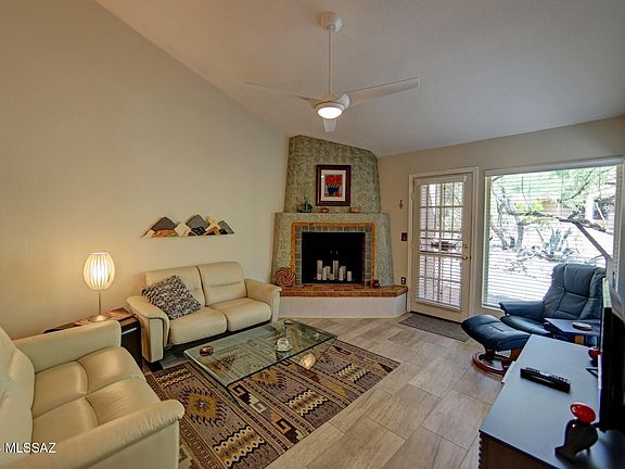 Desirable and Sought Sin Vacas Villas Townhome in the Catalina Foothills, surrounded by beautiful desert, wildlife, peace & quiet yet so near to high end shopping, restaurants & more. N/S orientation, private back patio, security doors back and front. Updated open kitchen, quartz countertops & under lit glass cabinets spill into great room, vaulted ceilings, light and bright windows, Hunter Douglas shades & wood burning fireplace. Two bedrooms, renovated full bath with built-ins adjacent and also in primary bedroom. HOA includes, spa, heated pool, water, common area, landscape in front, manned guard, garbage, fire protection. Carport #47. 28 days min rental required. Fitness center, clubhouse library & walking trails. Washer/Dryer/ Refrigerator remain. Location, Views & Amenities!