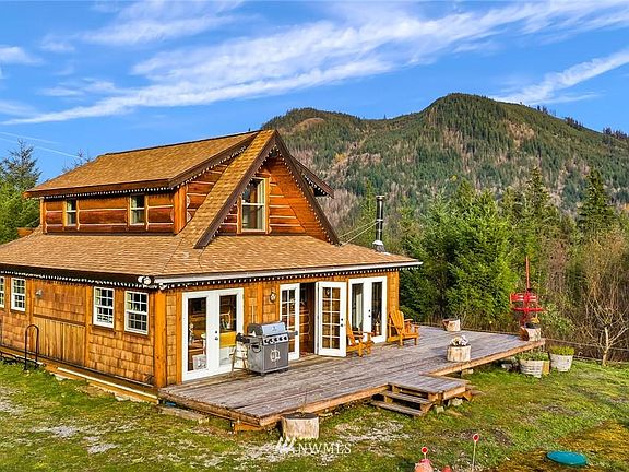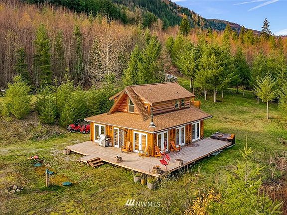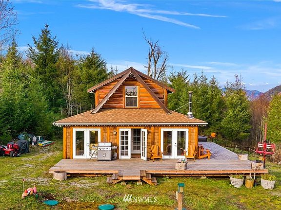 One-of-a-kind pristine log cabin on a secluded 19 acres off the Mt Baker Hwy. Amazing 360 degree views off the wrap-around deck. Wildlife galore, privacy to the max.