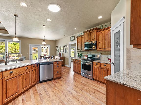 Gorgeous custom home on 1+ acre in Brittania Heights. Built by "John Cotner", this 1-owner quality home offers space, comfort & beauty. Open kitchen features granite counters, SS appliances, gas range, pantry. Great Rm w/trey ceilings, cozy corner fireplace w/lrg windows for viewing the beautiful backyard landscaping. Master suite w/lrg tiled shower, separate tub & dual vanity. Stunning lot w/gorgeous landscaping front & back. Mature trees from back property lines allows wooded feel. Cvrd patio 51x11 w/3 ceiling fans, gas BBQ line & hot tub plug. 14x24 insulated, heated shop w/pwr, 2 x 220V, 19' workbench, cabinets & 2 entrances: garage & exterior. Garage is insulated & fully finished & offers upper loft storage & generator transfer switch. 38' RV gar w/RV dump & 30amp RV plug. New exterior paint in 2022. Some doors/floors are flush for ADA. Low utility bills. 9' ceilings. Built-in central vac. Solar tubes. Water softener. Close proximity to I84, Boise, MR or Caldwell. Fantastic location. Room for shop.