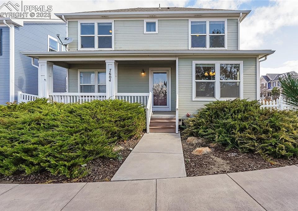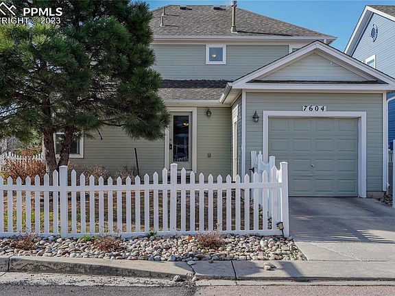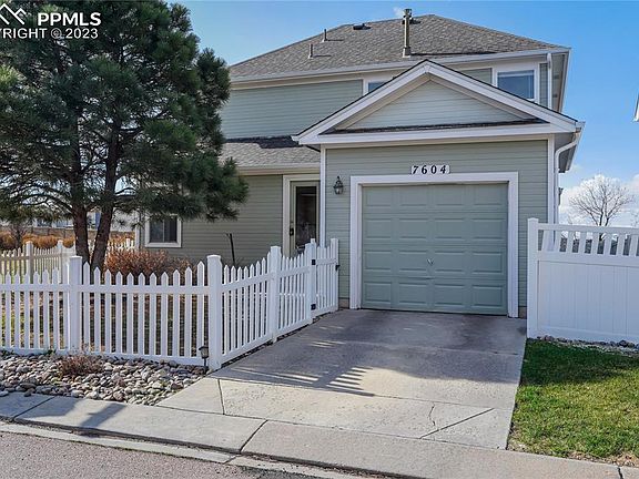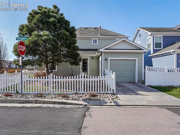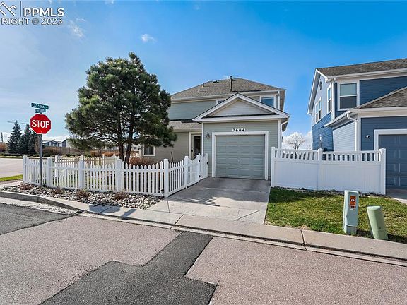 This charming 2-story 3 bed 2.5 bath home is located in a unique, idyllic North Powers neighborhood, with Pikes Peak views from the large front patio and mountain views from the upstairs bedrooms. With a white picket fence around the front and back of the home, the curb appeal will have you from the moment you arrive. The main level has all new LVP flooring, tons of natural light, neutral tones, and an inviting layout. The open, eat-in kitchen features plenty of space for your dining table, a separate pantry, oak cabinets, and white appliances. Cozy main floor living area. A natural flow to the upper level takes you to the master bedroom with a private bath and walk-in closet. There is a conveniently located laundry area, 2 additional bedrooms, and a hall bath. The attached tandem 2-car garage with easy access to the main level is insulated and has a workbench. Located at Stetson Hills and Marksheffel Road, with ease of access to Peterson Space Force Base and Schriever Space Force Base, New Pointe Center shopping, grocery stores, and endless dining options. There are walking/running paths right outside the door. Also, enjoy the various neighborhood parks and common areas available to area residents. For the neighborhood, the yard is bigger than most. Overall, a quiet, peaceful place to live in an advantageous location.