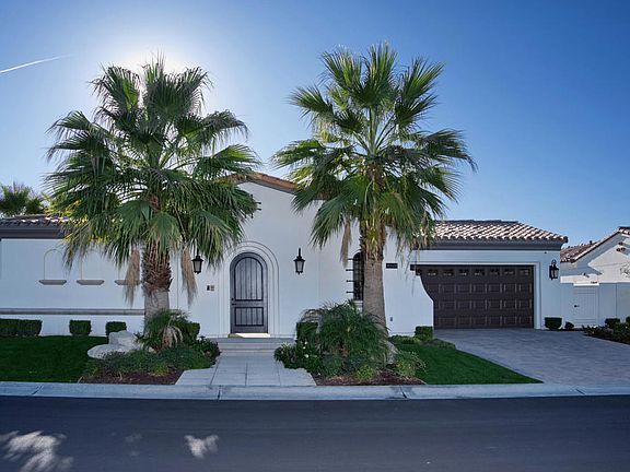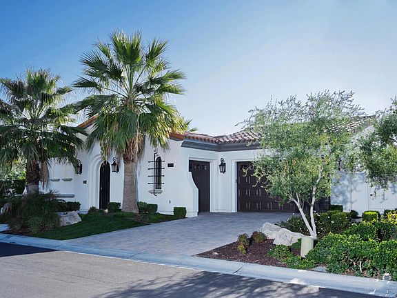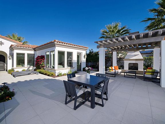 This gorgeous Plan 631 inside Toscana Country Club offers open-concept living with massive pocket doors that blend indoor-outdoor entertaining space, overlooking gorgeous views of the desert mountains and Jack Nicklaus Signature Golf Course. This well-appointed home boasts luxurious details of Early California architecture with two courtyard fireplaces, a light and bright interior with pops of vibrant colors, whole-house Sonos audio system with speakers both inside & outdoors, a floor-to-ceiling fireplace surround, designer fixtures, and full wet bar. The massive gourmet kitchen features white cabinetry topped with gray-veined white quartzite countertops, island with gray accent quartzite countertop, separate breakfast bar, and SubZero Wolf stainless steel appliances that include double oven plus separate warming zone, oversized double-door refrigerator, six-burner range with wall-mounted pot-filler and hood, and two dishwashers plus two freezer drawers in the island. After an evening of entertaining guests around the custom pool and spa, relax in the master suite that features a gorgeous wrap-around fireplace with white and gold accent wall, and a resort-like master bath with heated flooring, freestanding soaking tub overlooking a picture window, and glass and tile walk-in steam shower. Guests can retire to either of the main-home guest rooms each with their own en-suite, or the spacious guest house with sitting area and kitchenette, and a beautiful en-suite bath.
