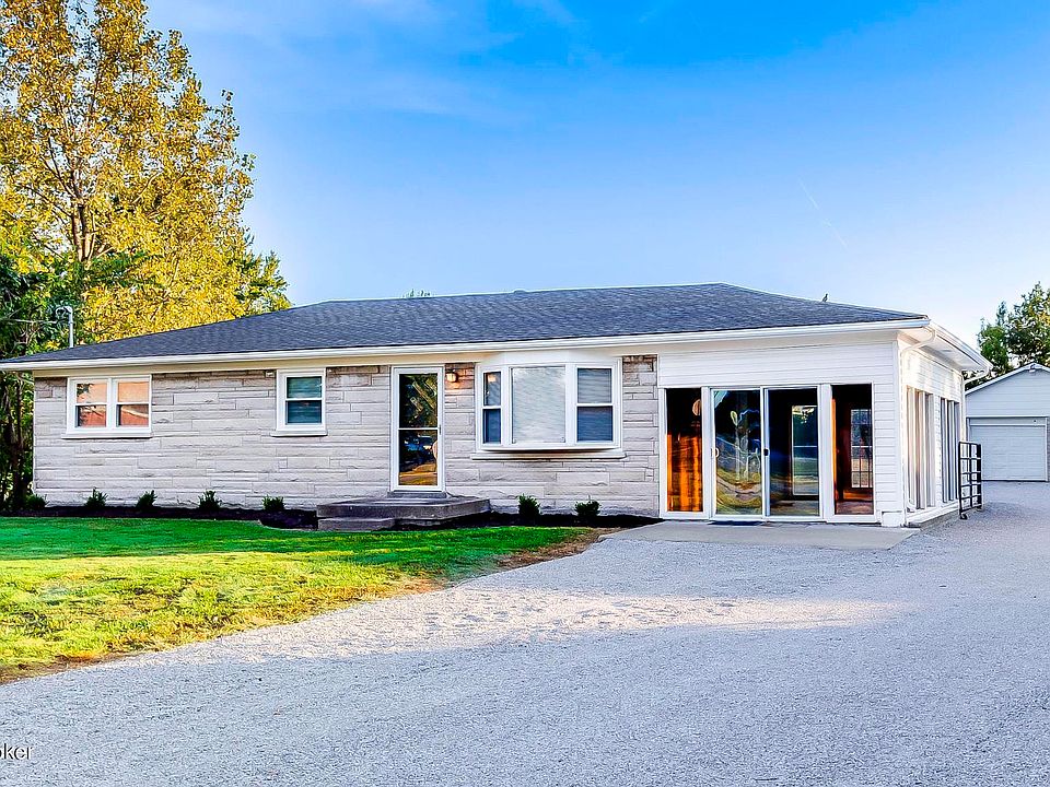 Beautifully updated ranch home situated on a large flat lot at nearly a full acre in a fantastic location and endless possibilities. This house features an expansive driveway and parking pad, tandem 3 car garage with extra workshop space in the rear, a newly fenced back yard and well-appointed sunroom off the side of the home. Inside you will find an open concept living room and kitchen that offers a ton of cabinet space, stainless appliances, quartz countertops and large island. The home also features a newly renovated full bath and 3 bedrooms. Updates include new roof on both the house and garage, new HVAC equipment, new windows and much more. Schedule your private showing today!!!