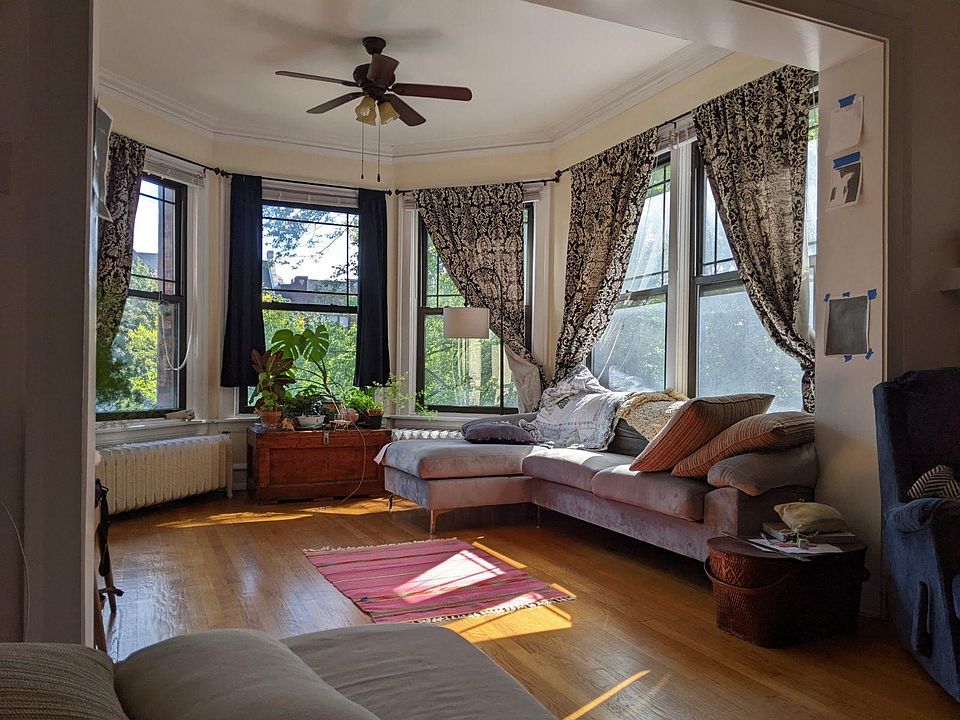 Third floor jumbo vintage building. Great view, front sunroom surrounded by large windows. Enclosed balcony which stays cooler in the summer from lake breeze. Truly a huge apartment. 3 sunporches although not heated. too many closets. mohagony panelled dining room. Pantry in kitchen. Nice hardwood floors. Decorative fireplace surrounded with bookshelves. Laundry is free with the condition that 2 apartments are responsible for any repairs. one car garage included. Space for grill shared in the back. Close to transportation. Close to the lake and Evanston tenants pay for electricity and cooking gas