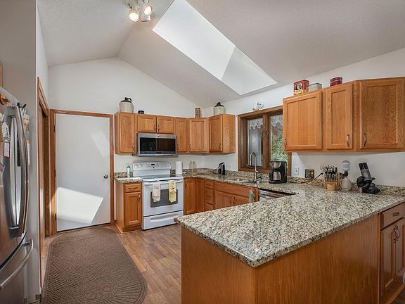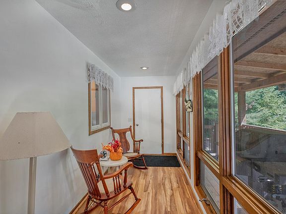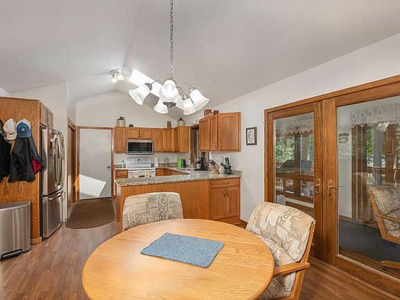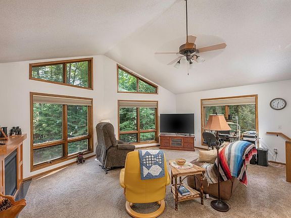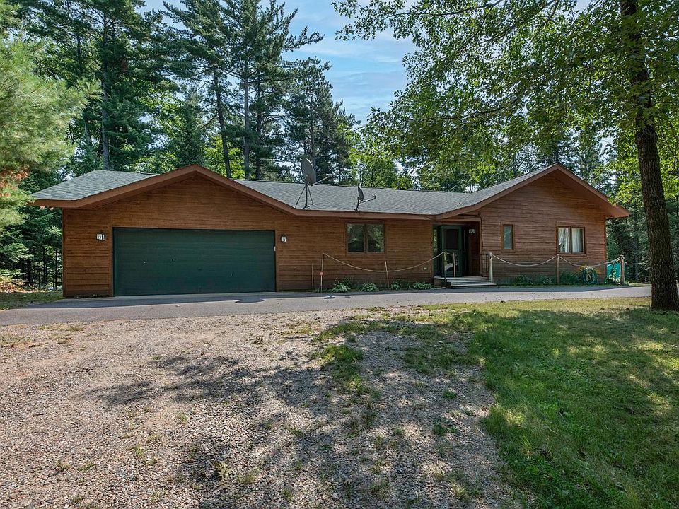 3 bedroom, 2 bath home on a nicely wooded lot, located on the thoroughfare between Sand and Stone Lakes part of the Sugar Camp Chain of Lakes. Wall of windows in the living room with fireplace, spacious bedrooms, sun porch, and walk out lower level. Permanent pier wide enough for access with golf cart, 2 car attached garage and 3 car detached garage with an additional heated office/workshop space attached. With end of the road privacy this house is a must see. Make plans to view today!