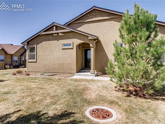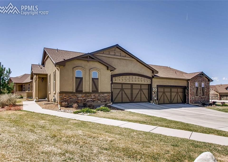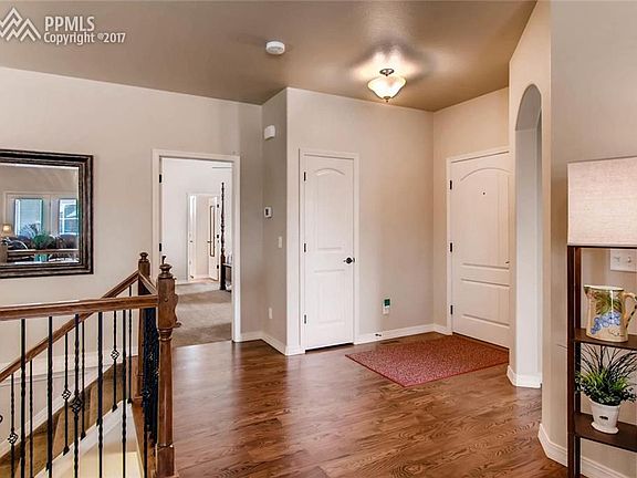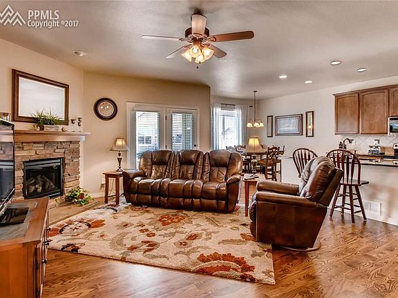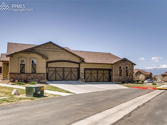 Walk into this beautiful 4 bed, 3 bath home with a 2 car garage. Premium lot location in a quaint cul-de-sac setting. As you walk in the living room you will notice how open and bright it is with 9' ceilings. The dining room will take your breath away with Pikes Peak views. The kitchen boasts granite counters, large prep island, plenty of cabinet space, hardwood floors and a dedicated pantry. 42" Cabinets and drawers feature "soft close" engineering. The master bedroom is a complimented by attached bath with double vanity The basement has it's own wet bar complete with electricity for a wine fridge. There is plenty of storage under the stairs. The guest bedroom also has a full bath and boasts two closets. This home has A/C, a Rheem water heater, stunning wrought iron railing and roof less than a year old. Perfect for those wanting to enjoy their home without all of the exterior maintenance. The HOA takes care of trash, snow removal, exterior maintenance and landscaping. The home also comes with Simpli Safe security system, monitoring starts about twenty dollars a month. This home is a must see!