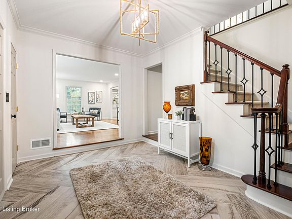 Welcome to this striking renovated two story in Hunting Creek with picturesque views of the golf course as you enter the convenient circular drive, side entry two car garage and charming walkway to the front door. The foyer sets the tone with modern neutral color scheme, beautiful herringbone patterned porcelain tile, a dramatic wrought iron turned staircase, double closets and striking brass chandelier. From the foyer, access either a spacious living room on one side or the dining room which is accented by another beautiful brass chandelier and opens to the completely renovated kitchen. Modern pendant lighting showcases a convenient center island with all new custom cabinetry, quartz countertops, new stainless appliances, and breathtaking views of the picturesque backyard. From there, also access the convenient laundry room with built-in storage and two car garage. Arched doorways lead you from the kitchen past a charming guest bath and into the large family room with stone fireplace flanked by built-in bookshelves and floor to ceiling windows with more views of the park like backyard and access to the multi level deck. The floor plan is open and perfect for entertaining family and friends. The second floor offers four spacious bedrooms with new carpet and ceiling fans. The hall bath has been completely renovated with more custom cabinetry, quartz counters with double sinks, a mirrored wall, and beautiful brass lighting. The secluded and spacious primary suite includes another new elegant spa like bath with more quartz, porcelain and brass accents, custom cabinetry with crystal knobs and spacious shower with bench. The primary walk-in closet has been newly designed for maximum storage. The walkout lower level offers plenty of room for entertaining, including a family room with another fireplace and flexible space for play room, craft area or workout room. There is also a convenient updated half bath and access to the patio and secluded backyard. Enjoy the immediate benefits of this complete and thorough renovation!