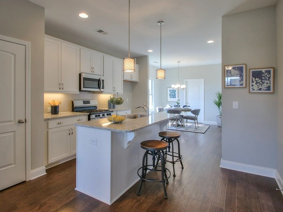The Elmwood Townhome Floorplan. This two-level, end unit, 3 bedroom/2.5 bathroom home offers a beautiful front porch, low maintenance living, and a bright and airy kitchen with upgrades that include white quartz countertops, tile backsplash, and beautiful gray cabinets. The Knoll at Fairvue is a perfectly situated community that is walking distance to Publix and dining options. Come visit us today to learn more about this home and community.