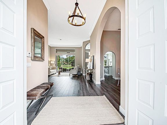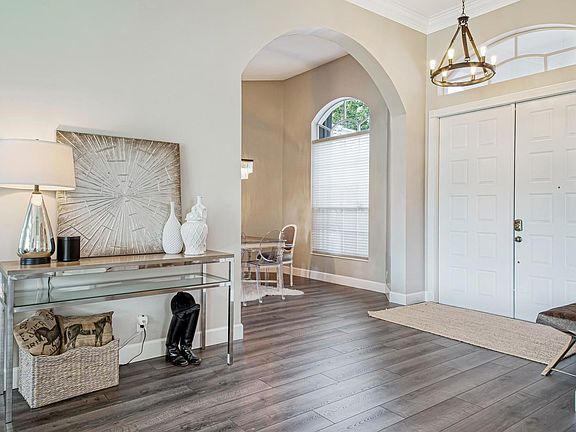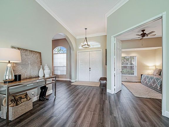 Discover the elegant style and casual comfort of this 4 bedroom, 3 bathroom home. Perfect for entertaining with a formal living room, formal dining area, family room and a covered patio. The open concept dream kitchen includes quartzite countertops, tiled backsplash, under cabinet lighting, stainless steel appliances, double oven, cabinets with pull outs and a snack bar. Master retreat boasts a double door entry, slider to the patio and his and hers closets. The opulent master bath features double sinks, jetted tub and a walk-in shower. This home also features a split floorplan, newer roof, 20' ceilings, neutral wood look flooring, crown molding, accordion shutters, Ring cameras, and an abundance of natural light.