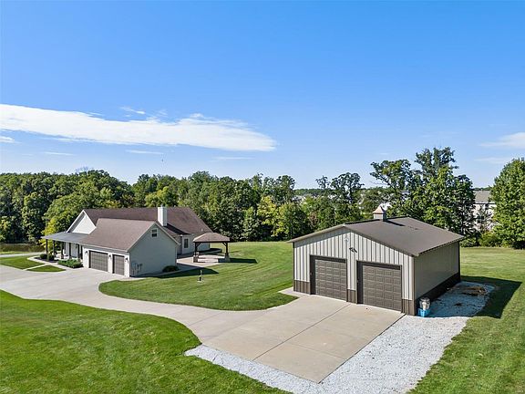 This one owner custom-built ranch, by Schulte construction, greets you with inviting curb appeal of a wraparound porch overlooking a lake across the lane, side entry oversized 3 car garage with a workshop above and a 30’ X 40’ Morton building with 2, 10’ overhead doors. Warm interiors with a neutral palette with wood and tile floors and 9’ ceilings both main level and down. The cheerful kitchen has white cabinets, granite, with Frigidaire professional series stainless appliances and is wide open to the breakfast area and dining room. A brick and stone FP accent the great room that walks out to a huge patio partially covered and has a gazebo as well. In addition to the 3 main floor bedrooms, the walkout lower level offers 2 more bedrooms, full bath, family room and bonus room. And geothermal heat gives you an average electric bill of only $150/month!
