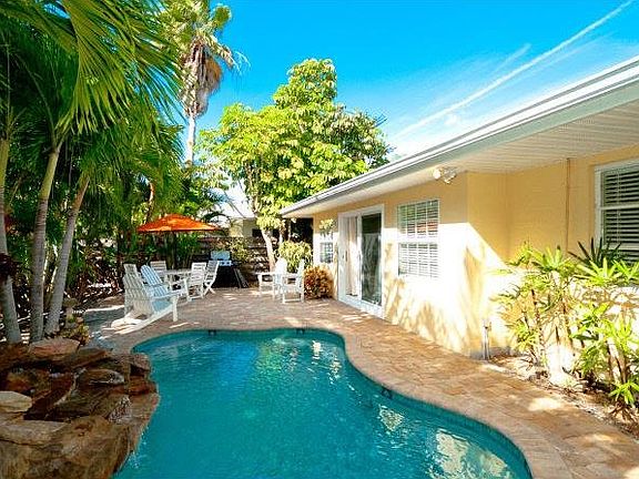 Located on the coveted north end of beautiful Anna Maria Island, this charmer is a short stroll to the beach. Just a block and a half from the beach entrance, this TURNKEY furnished home would make an excellent primary residence, vacation home or profitable rental property with bookings already in place throughout next year. Light-filled and bright, the home has an open floor plan that has been delightfully remodeled and wonderfully laid out providing plenty of space for family and guests. The kitchen has granite counters with bar stool seating and central to family living spaces. French doors lead to a large family sun room with over sized slider doors to the heated pool. The harmonious and tranquil private backyard has a wonderful open pool area with an expansive sun deck and tranquil waterfall. Pollywood patio seating, dining table and grill make for a perfect environment for family activities. The beautiful master suite with private bath has a walkout to a private deck through french doors. This well-maintained home with ample parking is also walking distance to Rod & Reel Pier and beautiful Bean Point and located in a quiet and peaceful neighborhood!
