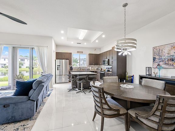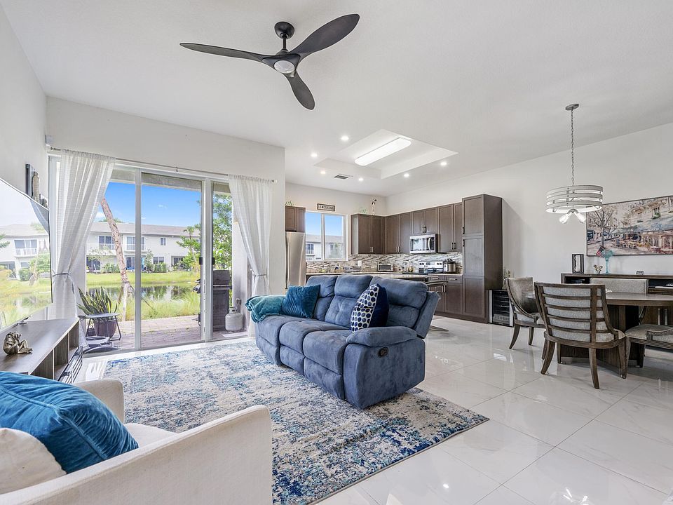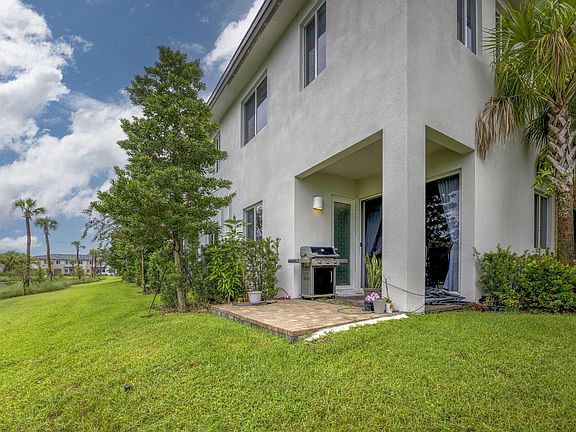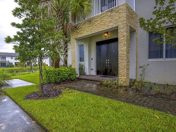 Rarely available elegant Lakefront Townhouse located in The Greyson at Pioneer Estate. Spacious and bright, boasting 4 beds, 3 full baths, 1 half bath, a loft and laundry upstairs. The sleek design blends modern and contemporary styles, offering beautiful lake views. Two primary suites, one on the main floor and one upstairs. Over $30,000 in designer upgrades w/ custom built-in closets in every bedroom, porcelain tiles throughout the first floor and plank vinyl upstairs. No carpet. 1 car garage. Corner unit with impact windows and doors, 10'8 ft ceilings, stainless steel appliances with an over sized kitchen island. The Greyson is a gated resort style community offering 2 pools, dog park, fishing pier, playground and much more. Close to Wellington shopping and dinning, A rated schools.