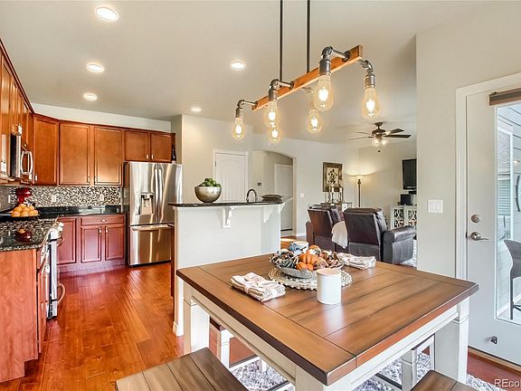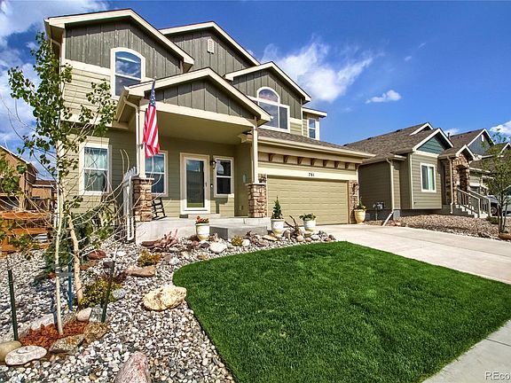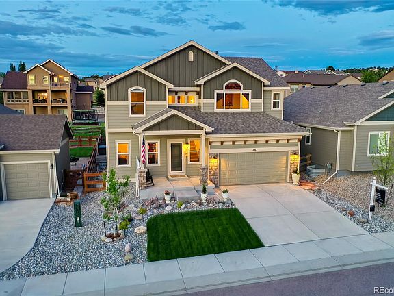 Gorgeous home with so many upgrades in desirable D38 schools. Open floor plan with upgraded hardwood floors in living room & office added and unique light fixtures. Kitchen has custom backsplash, granite counters, SS appliances and pantry. Spacious master bedroom has vaulted ceilings, Pikes Peak views and adjoining 5-piece bath with dual vanities and soaking tub. Bright full size office on main level with hardwood floors and upgraded lighting. You will love the amazing outdoor living space with beautiful 24 x 12 wood deck! Upper level is completed with 3 additional bedrooms, full bath & convenient laundry room. The fully fenced backyard has aspen & pine trees and backs to walking trail with gate access. Extra features include added insulation to garage around master bedroom; upgraded front & back high end storm doors; added security lighting and 3-car tandem garage; Hepa filter box added to furnace. Red flagstone walkway from driveway to back patio and leads to access to walking trail. Extra features include an automatic sprinkler system; wireless thermostat and garage opener that can be controlled from phone. Convenient to I-25, shopping, restaurants and park.