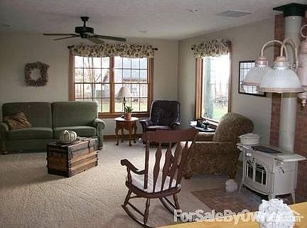 COLONIAL RANCH ON BASEMENT -5 bedroom including Master -apprx 2435 square feet on main floor -apprx 525 finished area in basement 2 bedrooms with egress windows in basement 1 full bath in basement large sewing/playroom in basement -remainder of basement unfinished -3 bedrooms on main floor. -split bedroom floor plan -2 full baths on main floor -large custom cherry kitchen open to great room and breakfast -breakfast nook -great room -woodburning stove in great room- heats most of the house -office -large dining room -large laundry/ mud room -entry with hardwood floors -poplar trim, 3 1/2" door and window trim, 4 1/2" baseboard -6 panel poplar solid core doors -oversize garage with 18'wide x 8'high garage door/ opener -storage above garage -2.58 acre beautiful wooded lot -LP gas furnace -central A/C -central vac -well / septic -brick / vinyl siding with tim detail -builder owned and occupied -garden shed; 15' x 20' board and batten