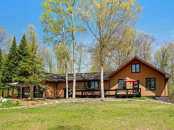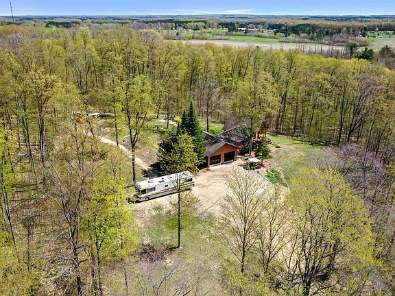 Contemporary home with a Mid Century vibe, truly turn key. New carpet throughout within 3 years, all stainless appliances, dishwasher and refrigerator less than 2 years old. Newly done Italian tiled walk in primary shower with lovely sliding glass door. Beautiful tile kitchen floor and truly amazing aggregate entry floor and stairs to the lower level. New electric panel and meter within the last 3 months. 10 acres of rolling hills and hardwood, primarily maple and beech. Shared pond at the back of the property, great for wildlife watching with the included canoe. The interior walls are lined with hardwood tongue and groove boards, truly exceptional work. New remote controlled ceiling fan in the living room, many newer light fixtures, many dimmers. Beautiful open kitchen with gorgeous fireplace, huge island, really great for entertaining. New 3 zone mini split heat pump heating / cooling system keeps you cool in the summer and warm in the winter and is super quiet. All exterior trim paint done within 2 years. Newer belt drive wi-fi connected garage door openers, and huge perimeter Invisible Fence brand pet containment for your furry friends. Incredibly huge garage / workshop space! Need to store 9 cars? You can! Both garage doors are 10 feet tall, the back 40+ feet is insulated and separated by a newer insulated overhead door. Hot and cold water at the back of the garage and plenty of 220v circuits for all of your tools. LED lighting throughout the garage. Bring your off road toys; there are trails on the property and more are a short ride away. Make your own maple syrup, eat the vegetables grown in your large garden, and have daily bouquets of flowers picked from the expansive beds. This is truly the “Up North” experience you have been searching for, close to Traverse City, close to Cadillac, easy access to 131 yet secluded in the woods! Many furniture items and equipment are negotiable. Adjoining 10 acres for sale to the East. Separate seller, MLS #1917519.
