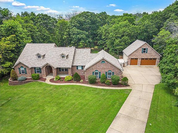 A RARE FIND! Stunning ranch estate sits on 5 acres of usable serene land. Special features incl: beautiful in-ground pool, expansive (fenced) sundeck w/ cool coating, 21x19 covered patio...all overlooking parklike setting w/ wooded backyrd. Need extra space? There are TWO oversized 3 car garages. Detached gar. includes a full bath w/ access to pool & a nearly finished loft w/ hvac & wtr htr. (future guest house?) Main house has a covered porch & opens to a nice entry flanked by an office & dining rm. Vaulted great rm has tall palladian windows & beautiful brick fireplace. Breakfast rm & Kitchen overlk the pool w/ sliding Pella dr, granite counters, bkfst bar & walkin pantry, plus easy access to main flr laun. Primary Bed ensuite has freestanding soaker tub, dual vanity & exquisite tiled shower, plus organized w/in closet. Fin w/o lwr lvl has wet bar, elec fireplace, den (4th bed?) w/ full bath. Roof (2018), HVAC(2018), (2) 200 amp elec, sump pump, lutron switches, fresh paint & more!
