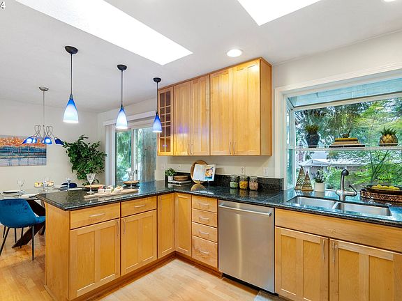 Discover the perfect blend of comfort & style in this beautifully updated home nestled in the desirable Garden Home neighborhood. The spacious living room, complete with a cozy woodburning fireplace, sets the stage for relaxing evenings. The kitchen is a cooks delight, featuring new appliances, a convenient eating bar, skylights, pantry & solid wood cabinets. Retreat to the primary bedroom, where you'll find an en-suite with a walk-in shower & closet built-ins for optimal organization. The lower level features an extra versatile living room with a certified woodstove & charming bench seating. Conveniently located next to the bonus living room is a fourth bedroom & a full bathroom, an ideal space for multi-generational living, guest quarters, or a home office. Step outside to enjoy the fully fenced backyard, featuring mature plants, two-level decks & a firepit perfect for outdoor entertaining. Additional features include an efficient 95% furnace, double pane vinyl windows, fresh exterior paint completed in May 2024 & so much more! Don't miss this chance to own a charming, well maintained home!