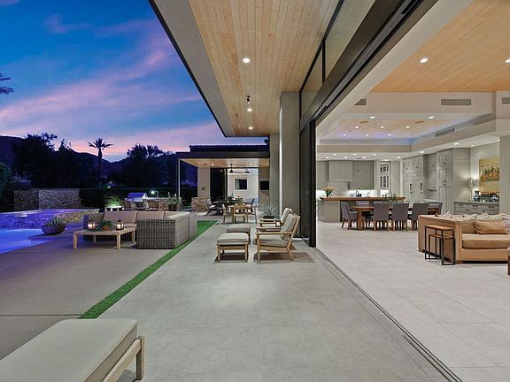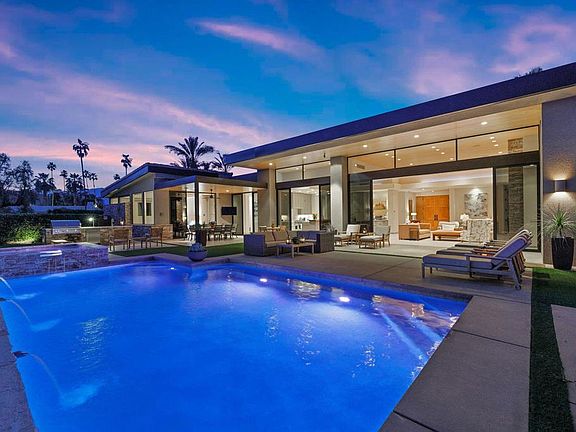 Mountain-View Masterpiece inside the gates of Eldorado Country Club-15th Hole. This exquisite custom home is a testament to meticulous design and attention to detail. Every aspect has been thoughtfully curated by the owner to seamlessly blend contemporary and transitional architectural elements with the awe-inspiring backdrop of Mt. Eisenhower. Exterior and interior stone harmonize with the natural mountain surroundings, while the varied-elevation wood plank ceilings in the Great Room elevate the space, capturing the grandeur of the view. Pocketing sliders at both ends seamlessly merge indoor and outdoor living. The ultra-private south-facing backyard and expansive covered patio area feature a fabulous pool, spa, fire pit, and built-in BBQ area. Artificial grass, low-maintenance landscaping, and owned solar contribute to the ease of upkeep and sustainability. The open-concept kitchen, with a sit-down counter made from Oregon Fir, is a focal point of the room. A butler's pantry adjoins. The den is the perfect space to relax and take in the spectacular mountain view. The master suite, with new walnut flooring and a fireplace, views Mt. Eisenhower and has direct access to the pool patio. The luxurious master bath with a heated floor, fully fitted closet, and laundry room all adjoin to maximize functionality. Three spacious guest suites, a powder room, and a two-car plus golf cart garage complete the design.
