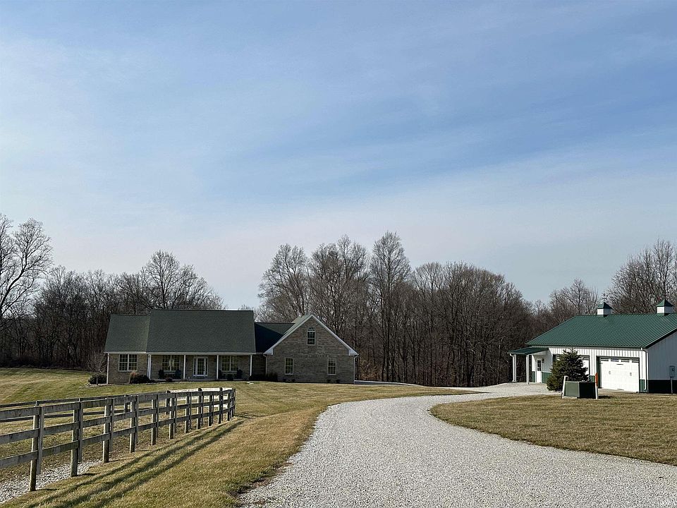 Pristine 23acre equestrian estate! Gorgeous 3600+ sq ft 4 bed/3 full bath ranch w/beautiful hardwood floors custom woodwork, soaring cathedral ceilings open concept living easy for entertaining. Custom stone gas log fireplace, large screened in back porch, fire table. Schrock cabinetry w/quartz countertops backsplash, farm sink,+ stainless steel appliances. Attached oversized 3 car garage w/water, AC/heat. 48x30 detached garage/workshop. 185x66 indoor riding arena w/sound system, wifi 66ft mirror. 96x36 horse barn w/9 stalls, concrete isle, tack room (heat/AC/laundry/kitchenette/bathroom/wifi). 30x40 hay barn with 12ft ceilings, concrete floor, & ventilation. Total 4 Morton outbuildings. Beautiful views, landscaping.