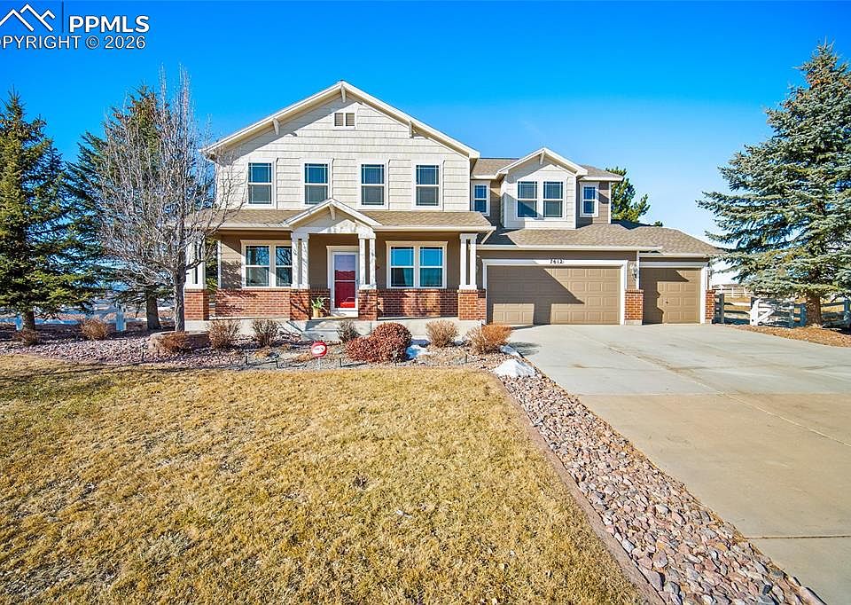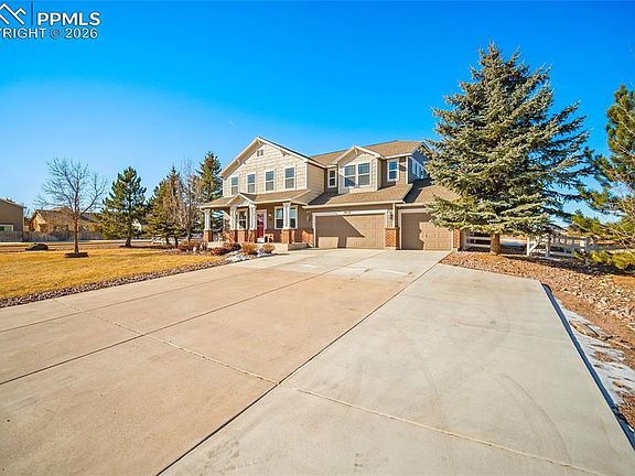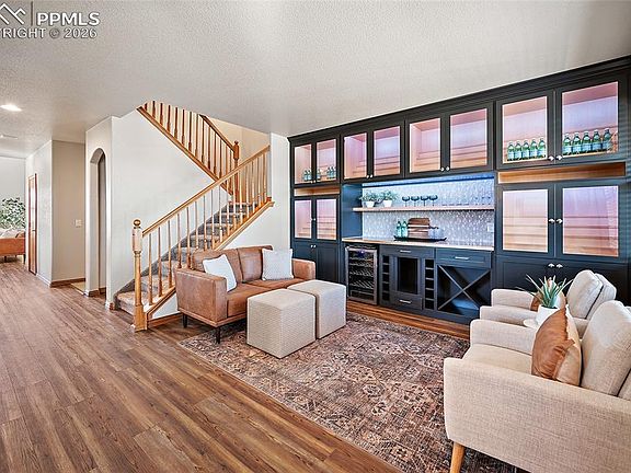 Welcome to this beautifully updated two-story home with a finished basement, perfectly positioned on a spacious corner lot in the desirable Woodmen Hills community. Thoughtfully designed for both everyday living and exceptional entertaining, this home offers expansive living spaces, quality finishes, and remarkable storage throughout. Just off the entry, a stunning Entertaining Lounge showcases a custom built-in beverage center with wine fridge and designer cabinetry—an inviting space to host guests or relax in style. The main level continues w/a large dining room, an eat-in gourmet kitchen with pantry, and a light-filled living room featuring a fireplace and oversized windows. A private main-level office with French doors and custom built-ins, along with a convenient half bath, complete the space. Upstairs, enjoy a generous loft with built-in shelving, a luxurious primary suite with window seating and storage, an impressive walk-in closet with island, and a spa-like five-piece bath. Two additional large bedrooms and a full bath provide comfort and flexibility. The finished basement is an entertainer’s dream, featuring a theater room with projector and drop-down screen, a spacious family room w/fireplace and wet bar, an additional bedroom, a 3/4 bath, and abundant storage including multiple closets and a mechanical room. Outdoor living shines with a massive covered concrete patio, Bluetooth speakers, a Michael Phelps Master Spa hot tub, natural gas BBQ hookup, and ample space to gather and unwind. An oversized four-car garage, with one bay thoughtfully enclosed as a versatile shop or hobby space, further enhances the home’s exceptional functionality and storage. Located just east of Colorado Springs, Woodmen Hills offers parks, recreation, access to Antler Creek Golf Course, nearby shopping and dining, and the added benefit of no city sales tax, delivering outstanding value and lifestyle. Completely updated and move-in ready, offering exceptional storage and space.
