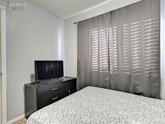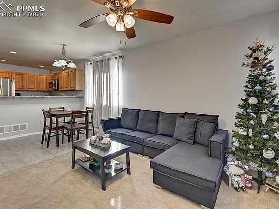 This cozy move in ready rancher is ready for its new owners!!! Located in Woodmen Vistas Community in desirable District 20. Enjoy the mountain views from your front porch. As you walk in you are greeted with an open floor plan and main level living. The kitchen offers upgraded stainless steel appliances and lots of cabinet space. All bedrooms are in the back of the home offering extra privacy and quiet. The side door gives you access to the large backyard with newly painted deck. Energy efficient property with paid off solar panels. Don't miss out!