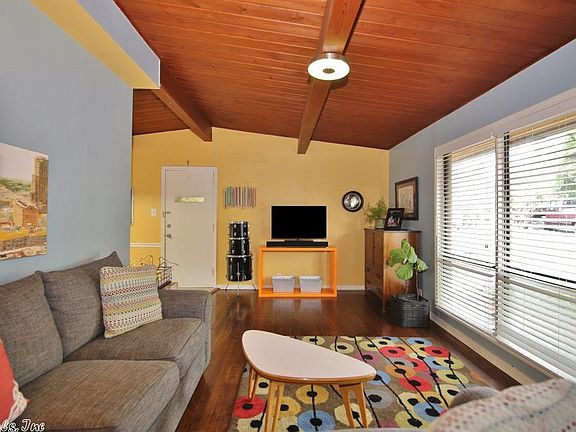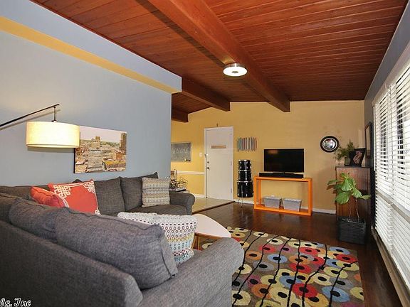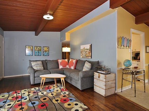 Cute mid-century modern home in Leawood on large flat lot. Hardwood flooring throughout, vaulted wood ceilings, and good natural light with large windows. Separate dining space off kitchen. Back patio is perfect for entertaining. Detached shop/storage building will convey along with all appliances. 1 car carport with additional storage. Perfect starter home or investment property.