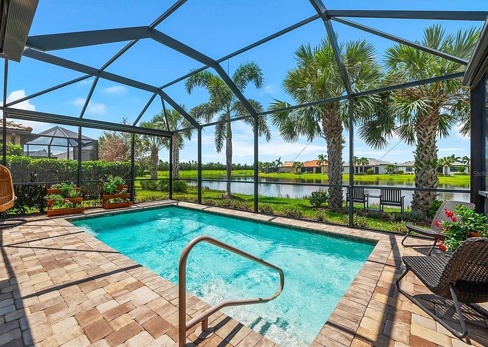 PERFECTLY DESIGNED STEEL CREEK MODEL –WATERFRONT LIVING IN DEL WEBB. This stunning Steel Creek Garden Series Model is truly a trifecta of perfection: the ideal location, breathtaking water views, and an intelligently designed floorplan. Here’s your chance to own in the highly desirable 55+ Del Webb community, located within Lakewood Ranch—the nation’s premier multi- generational planned community. Spanning 1,388 sq ft of thoughtfully designed living space on a quiet street, this home features 2 bedrooms and 2 bathrooms, with the flexibility to customize the guest suite to your needs. The second bedroom is equipped with a queen-size Murphy bed, proving versatility for guests or a multipurpose space. The chef-inspired kitchen showcases quartz countertops, upgraded wood cabinetry, and a layout that flows seamlessly into the dining and living areas—perfect for entertaining family and friends. The sliding doors open the home to its best feature: an expansive lanai overlooking the water, where you’ll be captivated by mesmerizing Florida sunsets. Outdoor living is elevated with a saltwater heated pool, accent cage lighting, and three remote controlled privacy screens, ensuring comfort and protection year-round. The lanai truly embodies the quintessential Florida lifestyle. The owner’s suite is a private retreat, featuring a dual sink vanity, spacious walk-in shower, and an oversized walk-in closet designed for ultimate convenience. Notable upgrades include crown molding and plantation shutters, custom draperies, and elegant finishes throughout, whole-home air purification system and central vac, new Whirlpool washer, hurricane impact windows and doors, security system, ceiling fans throughout, ceramic tile in main living areas with plush carpet in the bedrooms. The 2-car garage offers an additional 4-foot extension, providing ample room for storage or a golf cart, along with an epoxy floor finish. Meticulously maintained and move-in ready, this home blends style, comfort, and peace of mind in one exceptional package. Don’t miss this rare opportunity to own a slice of paradise in Del Webb Lakewood Ranch. Schedule your private showing today and make this beautiful Steel Creek Model your own.