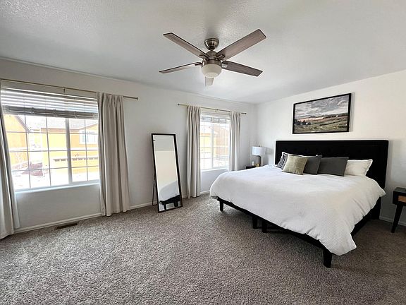 Great 3 bedroom, 2.5 bath property with a 2 car garage in school district 49. Newly painted and updated lighting/kitchen cabinets, with bonus room/area upstairs and large windows throughout the house and great natural light. The home also boasts new appliances included (dishwasher, refrigerator, microwave, and washer/dryer). Great views of the mountains from the front patio. Property also has a walking/running/bike path behind the house that has doggy bags and an open field for dogs to run around. There is an additional common use grass dog play area across the street on the front side of the house. Rooms are all spacious, to include large/walk in closets. Floors are carpeted upstairs with hardwood laminate downstairs. Location is close to Woodman avenue and only a few minute drive to HWY 25. Family friendly neighborhood and close to shopping and amenities within northern Colorado Springs. Owner is responsible for HOA which covers snow shoveling, trash, and landscaping. Small dogs allowed, but will entertain allowing large dogs depending on the dog. No smoking within the property but allowed outside. 1 year lease is preferred, but willing to rent for shorter or longer terms with a minor increase or decrease in price. Renter is responsible for utilities and internet.