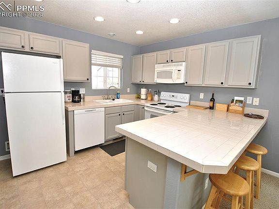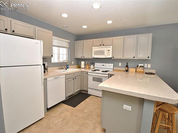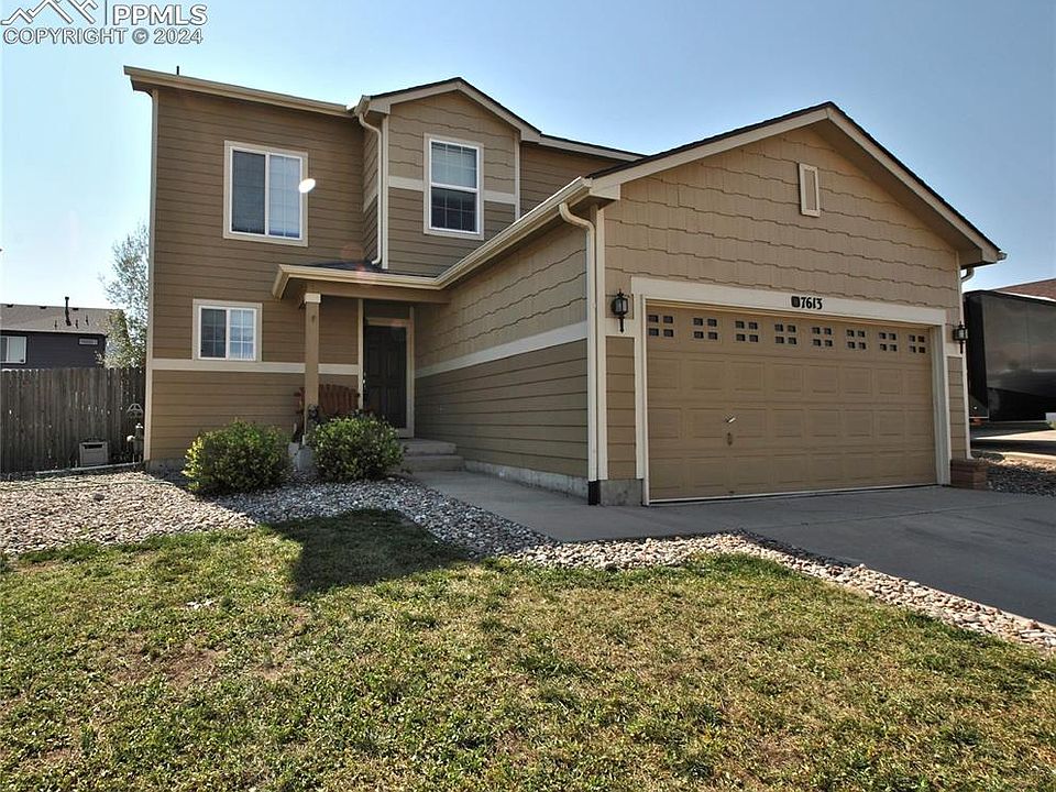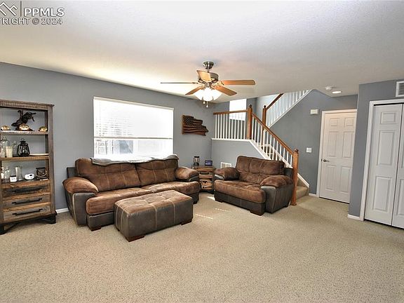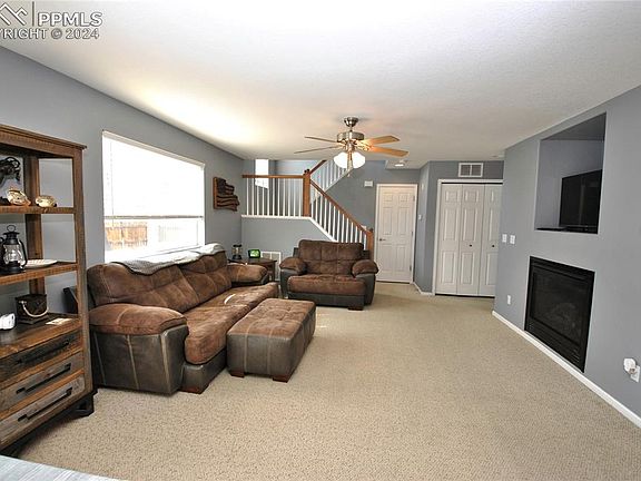 BEAUTIFUL STARTER HOME!! That's Move in Ready. 2 tone gray and white package modern and Newly done with white 6 panel doors and blinds. Open and airy living room with gas fireplace that flows into dining and kitchen areas with counter bar, refrigerator, microwave oven and New dishwasher. New light fixtures accent all the baths and nice size 2 car garage has plenty of room. Newer exterior paint, roof and windows from 2018. Window A/C for the upstairs compliments the bonus family room. Close to Fort Carson, Schriever AFB and Peterson AFB and ready now!