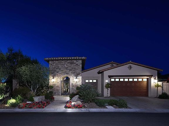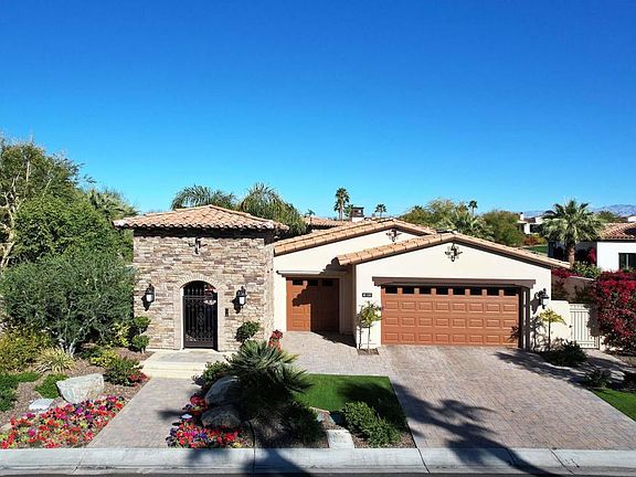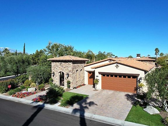 This immaculately-finished Plan 502 home inside Toscana Country Club offers over 2,600 sq.ft of contemporary-modern living space on an oversized Amalfi homesite. This corner lot feels tucked away with mature, lush landscaping that offers privacy in both the backyard as well as the expansive courtyard with pool, art sculpture, outdoor dining patio, and hidden rock speakers for the ultimate desert oasis experience.Inside, modern designer finishings include retro-inspired light fixtures; custom interior doors; upgraded cabinetry throughout the home; Basaltina porcelein floors; and bold colors, patterns, and textures in the paint, wallpaper, and wall tile. Three sets of sliding glass doors wrap around the great room for access to both the backyard and the entertainment area of the courtyard, maximizing indoor-outdoor living. The gourmet kitchen features a gorgeous waterfall-edge granite countertop along the breakfast bar, ceiling-height cabinetry for ample storage, and SubZero Wolf stainless steel appliances.After an evening of entertaining around the custom pool, spa, and firepit, retire to the master suite that offers a massive, resort-like en-suite featuring a large, walk-in shower; soaking tub; and ceiling-height glittering backsplash. Guests can choose from two guest rooms with en-suites that blend Palm Springs mid-century style with Hard Rock Hotel design starring vibrant pops of color and texture.
