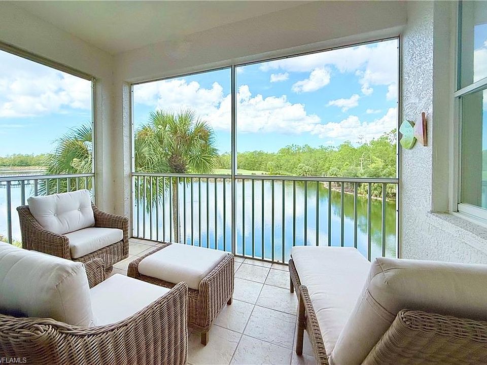 Beautiful condo with Golf Membership to Naples Heritage Golf and Country Club. This 2BR, 2Bath condo is being offered turnkey. Open concept, very popular Brookside floorplan. Condo has an abundance of natural light without the intense heat of sun. Enjoy a peaceful water, golf course and preserve view. Tastefully furnished and tile flooring throughout! Kitchen has SS appliances, white shaker cabinets, beautiful quartz countertops and breakfast bar. Eat in kitchen has bay windows that look out to water and golf. Kitchen is equipped with pantry. The main living area is open to dining area & kitchen which is perfect for daily living as well as entertaining. Living room opens to screened covered back lanai with tile floors. The NW rear exposure offers priceless sunset views. Dining room has built in cabinets and shelving. Spacious primary bedroom has plantation shutters, walk-in closet and smaller secondary closet for additional storage. Primary bath has been updated with white shaker vanity, quartz countertop, frameless glass shower door & newer lighting. Guest bedroom has plantation shutters, built in desk and storage unit along with custom designed closet. Guest bath updated with white shaker vanity, quartz countertop & newer lighting. Back screened lanai has tile floors. Deeded carport parking & outside storage room. Building equipped with elevator. Naples Heritage is a beautifully landscaped, gated, bundled golf community situated on 550 acres of pristine lakes & preserves. The 18 hole golf course, putting green, driving range, renovated clubhouse w/ pro shop, resort style pool w/ cabana, tennis courts, pickleball courts, bocce ball and fitness center are all part of the Naples Heritage lifestyle. Just minutes from downtown restaurants, shopping & beaches.