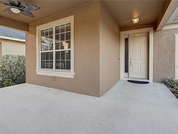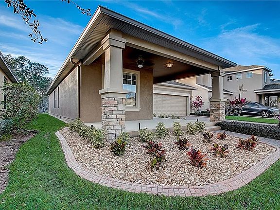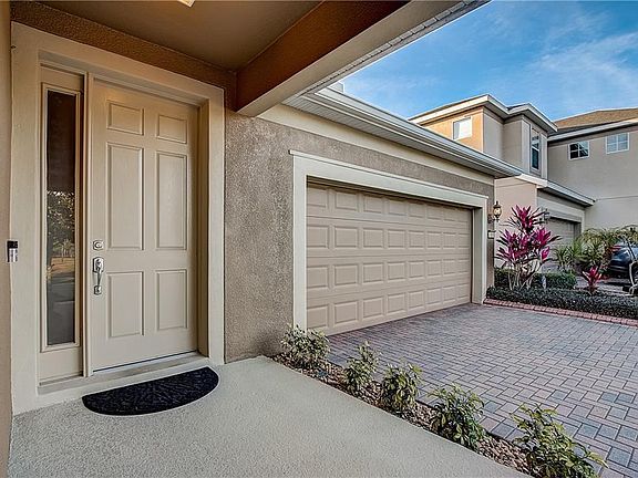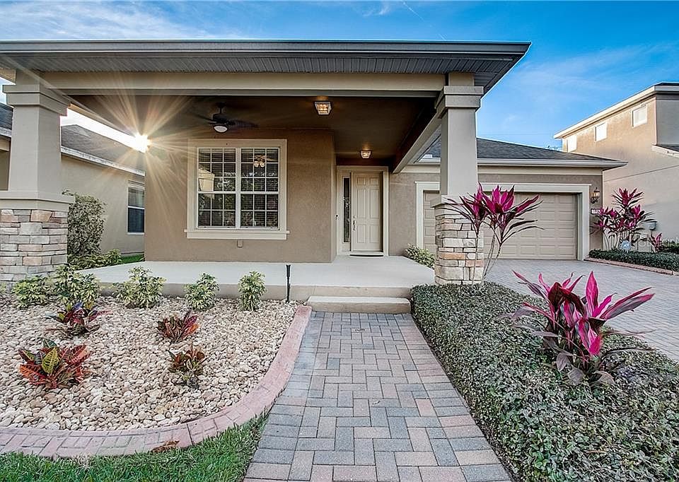 One or more photo(s) has been virtually staged. Sunsets and Fireworks! Watch the sun go down through wooded conservation from your back patio, and then witness the magic of Disney fireworks over the water from your pond-facing front rocker porch. It's Florida living at its finest! Inside, this 3 bedroom, 2 bath luxury home has an attractive floor plan that flows beautifully. The bedrooms are organized in a split-plan arrangement, the gathering areas are open and accessible, and the interior laundry room w/ utility sink sits adjacent to the 2-car garage for convenience. Full of upgrades, this property strives to make life easy. The interior has been freshly painted, brand new vinyl wood plank flooring has been installed (tile in wet areas), and durable granite counter tops add style and design throughout. *A full list of upgrades/updates is available upon request. 3-panel sliding glass doors open up the interior to a screen-enclosed back porch with 15' X 15' extended paver patio overlooking stunning conservation. And the covered front rocker porch faces a tree-lined pond w/ walking trail, ensuring no direct neighbors in front or back. Pure nature meets luxury and convenience, and of course amazing fireworks. Come meet your new home, today!