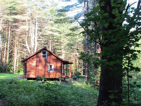 On ATV trail, just dn from snowmobile trl. The cabin is 20'x26', an open floor plan. 1 section is roughly partitioned into a bedroom area w/ the rest a great room. Upstairs is a bedroom loft. Though there is no bathroom in the structure, there is an outdoor bath area& outhouse. There is a hot water tank, propane fired& dug well access offers no foot valve, so water can be turned on year round, with pipes to drain automatically. Last year was installed a 1000 gallon concrete septic tank w/leach field with the thought they would add a bedroom and bath to the cabin. There is underground electric service, which comes into the house and two outbuildings, as well as an outdoor post, where a motor home could connect water and electric. Back up generator connections.