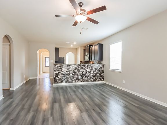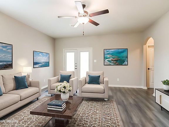 This gorgeous rental home has an open and expansive design that will encourage you to rest and unwind. You can have a family-oriented discussion in its quiet dining room. Its open kitchen and family area lead out to an expansive, sheltered outdoor patio, where you can all have drinks or lunches during the hot summer. In addition to a vast primary suite, it has two other bedrooms and two baths. The primary room has a bath en-suite. Except for the refrigerator, the property has stainless-steel energy-efficient appliances. Its kitchen features granite countertops and plenty of cabinets for storage. It also features an attached and a detached two-car garage. There's also a large, fully fenced backyard with a storage shed, a front porch, and some landscaping in the front yard.