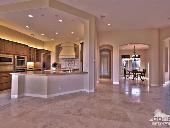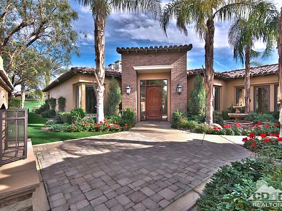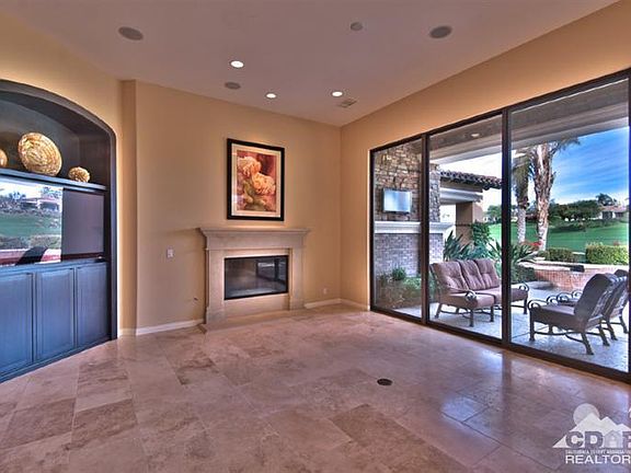Perfectly situated for down fairway and mountain views to the west and water views to the right. The Italianate elevation with stone and brick adds the Tuscan style exterior. The spacious courtyard with stone fireplace and sitting area makes it a wonderful place to enjoy the desert climate. The two room casita has a sitting area with a fireplace and bedroom ensuite. The angular foyer opens to the great room and views with angled hallways leading to the master bedroom and the dining room and guest bedrooms. The popular hobby room, the guest bedroom and office is at one wing of the home. The master bedroom with a fireplace has views of the golf course. The master bath has dual vanities, a step-in shower, separate bathtub and large walk-in closet. The great room with bar area and large kitchen is open to the great views as well. The back patio has a covered veranda, fire-pit, and pool and spa.