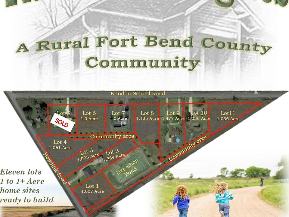 Ready to build your forever home? Dream big on "Lot 9" with 1 plus acres in just the right location of Fort Bend - Close to 90A, Spur 10, and US59/I-69, just past Rosenberg. A cleared grassy acre in a peaceful rural area with cows for neighbors, and country lanes for miles. Stop by in the evening and listen to the birds calling, and frogs croaking. This lot is part of a new sought after subdivision with light restrictions (No mobile homes and minimum 1800.00 Sq. Ft. construction) to let you develop your land for your future. Community shared space accessible from the back of each lot to mingle with the neighbors, take the dog for a walk or check out the pond. Randon Heights offers all the advantages of country living while still being close enough for work commutes. Choose your preferred builder with no building time restrictions. Call for your appointment today so you can call it Home! Builder inquiries welcome.