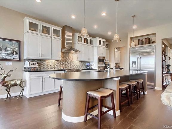 *Mattaport available under virtual tours.* Gorgeous Former Model Ranch Style Home less than 4 years old with a walk-out basement backing to the 18th fairway of Aurora's Premiere Award Winning Blackstone Golf Course! This home has no expenses spared! As the former model home, this open floor plan has every upgrade you can think of! Monogram Premium Grade Stainless Steel Appliances, staggered kitchen cabinets with custom back splash, large granite kitchen island with seating, butlers pantry with wine cooler, high ceilings on main floor and upgraded 9' basement ceilings, iron rod railing, tile inlay in the hardwood flooring as you enter the front door, tray ceilings, and wood flooring throughout common areas! The master suite is amazing and overlooks the beautiful golf course, has a high tray ceiling, access to back porch, hardwood floors, and an extravagant spacious en-suite master bathroom with tile from floor to ceiling, granite double vanities, soaking tub and a true walk in shower you will have to see! Next to the bathroom is the upgraded large master closet with custom built in closet system connecting to the laundry room! Home features an over-sized 4 car garage, everything you need on the main floor and fantastic views. Only a short 4 minute walk to the Grand Blackstone Country Club that offers a fitness center, pool, tennis courts, restaurant and grille, social activites and more already included in the HOA dues. Blackstone is just 5 minutes away from Southlands Mall, 15 minutes to Downtown Parker, and 20 minutes to DIA! Bring your buyers, this home will not disappoint!