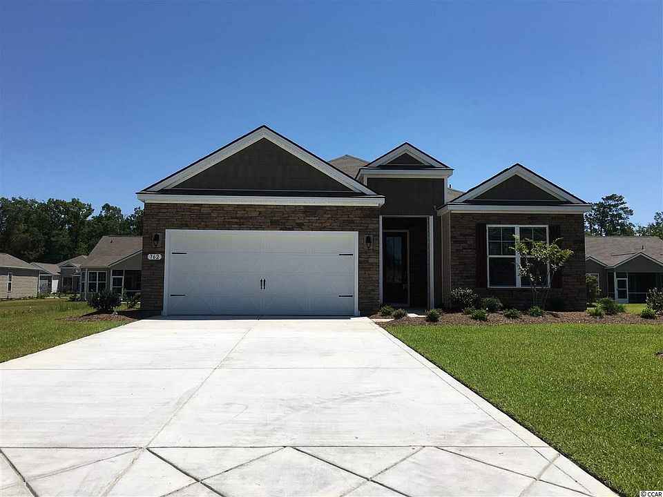 One Level Eaton floor plan with open and airy interior. Owner's Suite has Tray Ceiling, Walk-In-Closet and 5 foot shower. Relax and enjoy the lake views. This is a beautiful home located in the desirable Carolina Crossing community on a great lot next to the pond. There are elevated ceilings in the great room and all very open concept. There are hardwood floors throughout the main area and ceramic tile floors in the bathrooms and laundry room, crown moldings, stainless steel appliances, granite countertops and tile backsplash in the kitchen. This house is a must see! Pictures are of a Model Home. All dimensions are estimates and not guaranteed. Low HOA fee incl: Lawn Maint. & Irrigation, Trash pick-up, Basic Cable, Community Pool & Clubhouse.