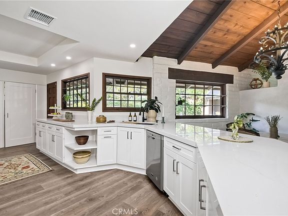 Step outside to discover a private paradise. The original kidney-shaped pool beckons on warm summer days, while the adjacent cabana provides the perfect spot for outdoor entertaining. The property is fully fenced and gated, ensuring privacy and security, and boasts hundreds of avocado and citrus trees, offering both beauty and a bounty of fresh fruit.