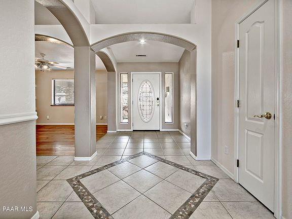 Majestic views of Granite Mountain, The Dells, + Flagstaff Three Sister mountains await you in this Prescott Lakes single level home. Charming front covered patio courtyard welcomes you into the relaxed living, open floor plan of this 3 bedroom, 2 bath, 3 car garage property.Custom tiled foyer leads to great room featuring wood floors, gas fireplace, w/ adjoining dining area providing access to the covered back deck. Seller agrees that the kitchen is ready for new appliances & is offering a $5,000 credit or interest rate buy down. Bonus area for office or den. Primary bedroom w/ full bath & spacious walk in closet. Lovely, treed backyard perfect for family. Plenty of storage / workshop area in basement w/exterior access. Prescott Lakes Club member is req'd with pool, dining, gym etc